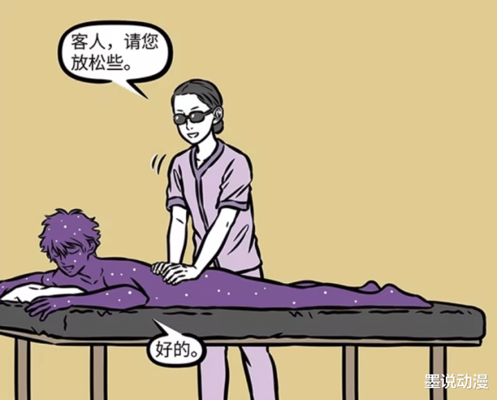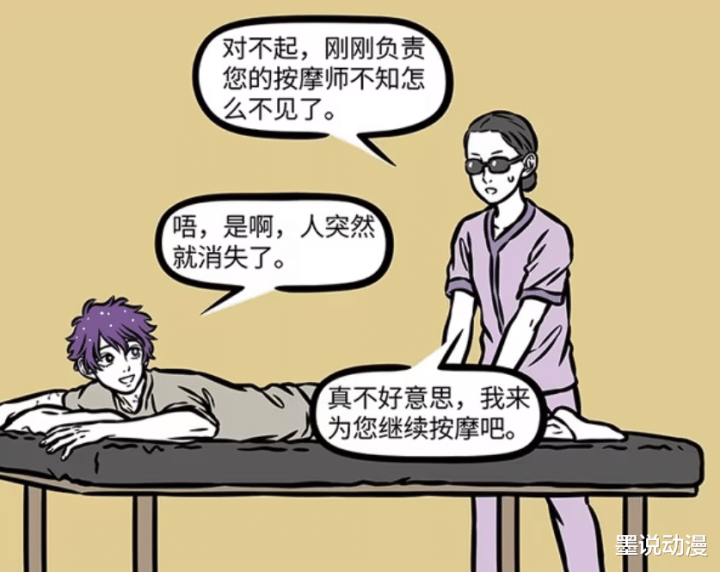 《非人哉》漫画版中,紫微大帝每到一个地方,就会影响这个地方的人。之前是影响了托尼老师和搓澡师。这一次紫微大帝独自一人去按摩,可是按摩师因为接触到他的身体,也看到了命运,最后还消失。另一个按摩师,哪怕戴着眼镜,也出现了同样的事情。